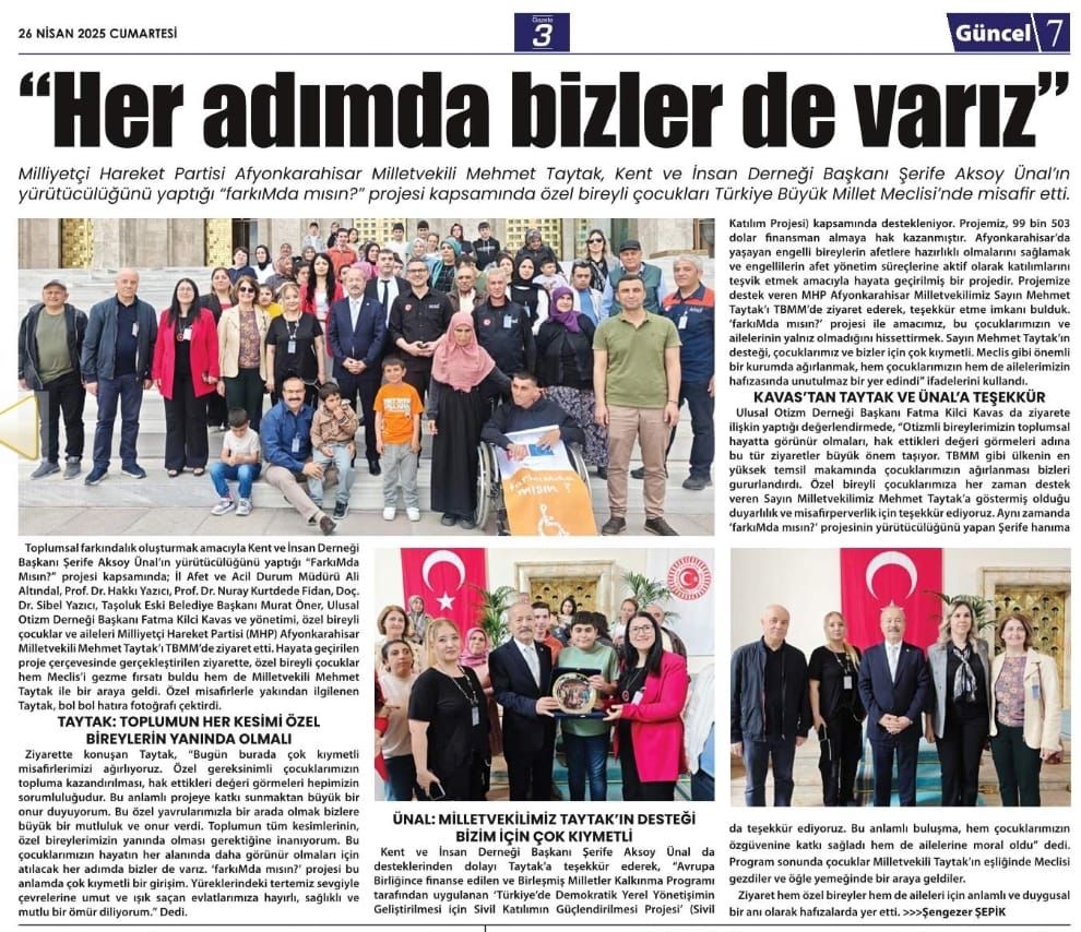 Milliyetçi Hareket Partisi Afyonkarahisar Milletvekili Mehmet Taytak ve Kent ve İnsan Derneği Başkanı Şerife Aksoy Ünal tarafından yürütülen “Farkımda Mısın?” projesi kapsamında özel bireyler Türkiye Büyük Millet Meclisi’nde misafir edildi.